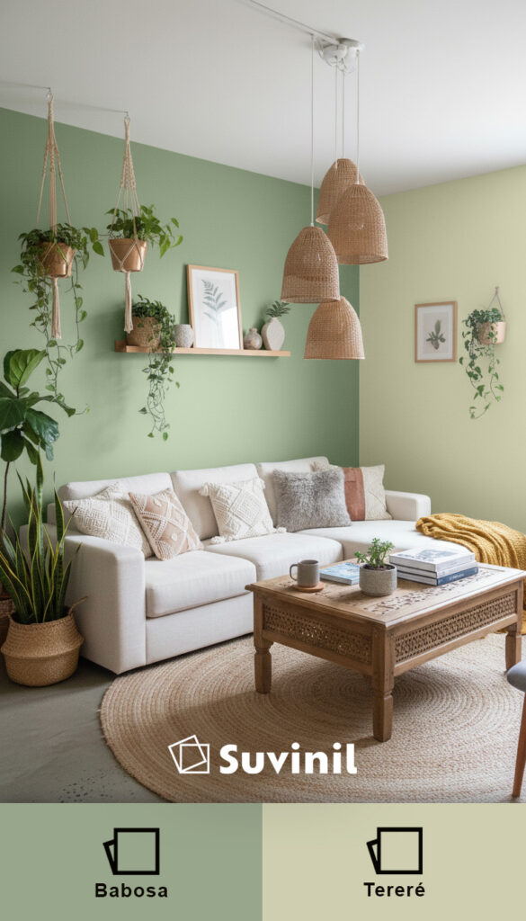 A combinação entre Babosa, um verde médio suave, e Tereré, um verde com fundo amarelado e acinzentado, cria um ambiente harmonioso e relaxante. É uma proposta que transmite frescor e modernidade ao mesmo tempo.