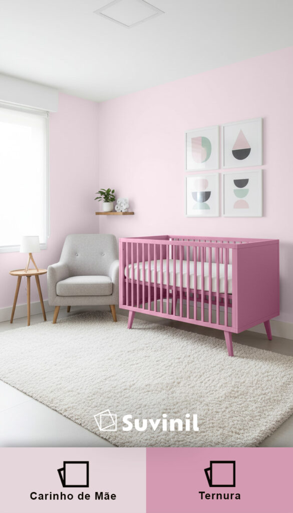 A combinação entre Ternura, um rosa acinzentado, e Carinho de Mãe, um tom claro puxado para o bege, cria um ambiente delicado e acolhedor. Essa é uma proposta suave que transmite tranquilidade sem ficar enjoativa.