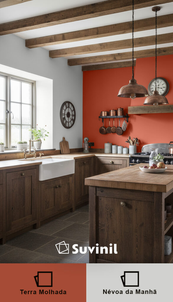 Para quem quer sair do básico sem exagerar, a combinação entre Terra Molhada, um alaranjado mais intenso, e Névoa da Manhã, um cinza claro, é uma ótima escolha. O contraste entre cor forte e neutro cria um ambiente moderno e elegante.