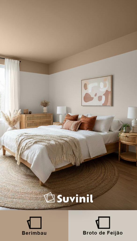 No quarto de casal, a combinação entre Berimbau, um marrom médio elegante, e Broto de Feijão, um bege claro, cria um ambiente clássico e confortável. É uma escolha segura que funciona bem em diferentes estilos de decoração.